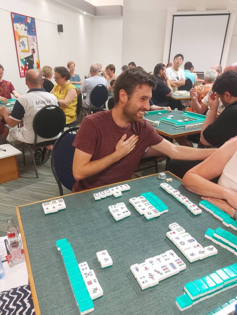 Toen het weer licht werd was het in rap tempo inschrijven en beginnen. Overal waar Chris aan tafel zat werden de gebaren voor chow, pung, kong en mahjong gebruikt. Er werd ook regelmatig bij de jonge Ossenaar geïnformeerd of ze wel het juiste gebaar gebruikten? En natuurlijk hoorde je vaak het van Chris zo bekende lachje. Tijdens de lunch kwam een Franse speler zich bij Chris voorstellen. Hij kende ook gebarentaal en al snel waren het de beste vrienden.