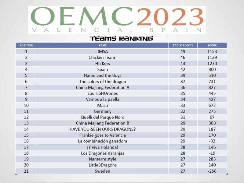 23:45 Blijkbaar kostte het de organisatie enorm veel tijd om de complete uitslag wereldkundig te maken. Maar met goede resultaten in de laatste ronde van zowel Olav als Jacqueline (beide 4 punten) eindigden ze beide boven in de bovenste helft. Laatstgenoemde op plek 59 en de schrijver dezes op plek 74. Voor team "Dragones Naranjas" waren de druiven wat zuurder. Met twee punten in de laatste ronde eindigt Sandra op plek 125. En Marjoleine? Met nog maar eens 0 (nul) punten wat haar totaal op 7 brengt laat ze tot nog drie deelnemers achter zich (waaronder ook nog een Nederlandse deelnemer). Maar een uiteindelijke 34e plek uit 42 teams staat niet in verhouding tot de werkelijk schitterende outfit die we droegen.