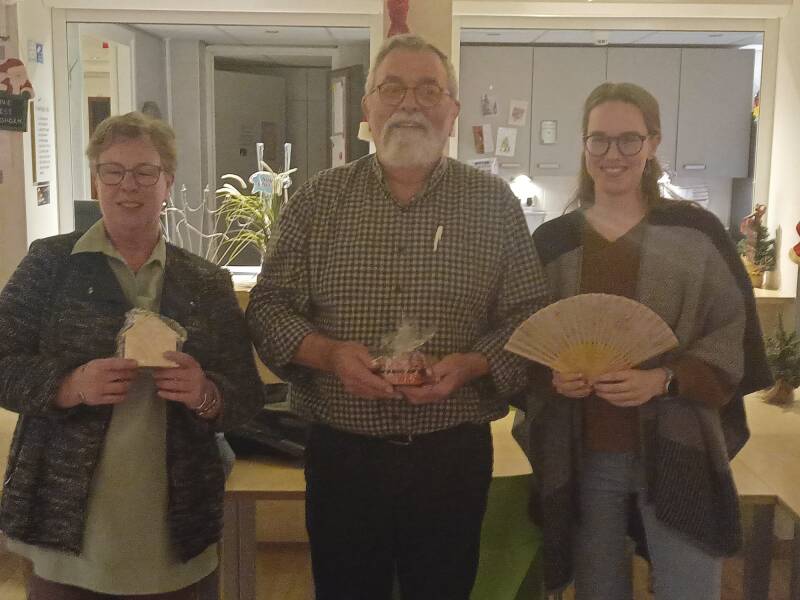 Met het noemen van de derde plaats komen we automatisch uit bij de rest van het podium. De recente winnares van de clubcompetitie (Anja O.) wordt tweede. En zoals het een voorzitter betaamd wint Kees B. de ere-titel "Oliebol van het jaar". Daarmee laat hij zijn goede vorm van de laatste tijd zien. Het zal de schrijver dezes niet verbazen als er binnenkort mooie uitslagen worden genoteerd.