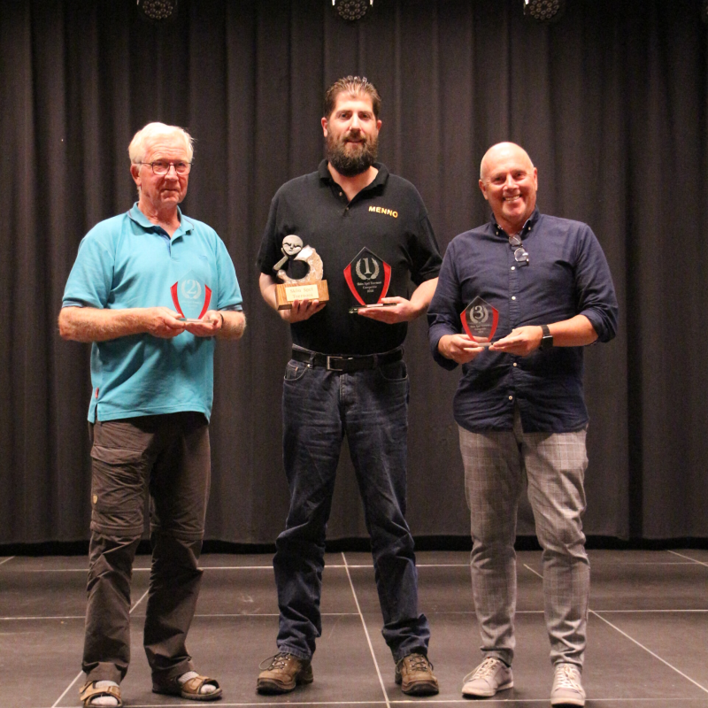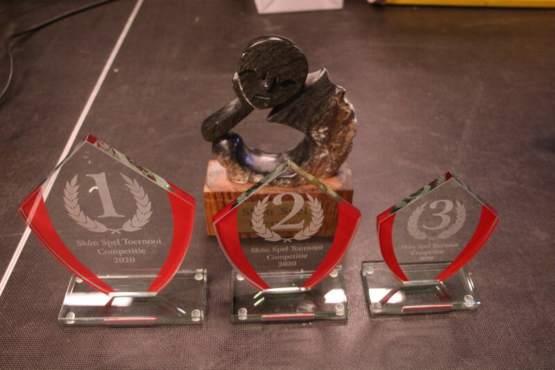 Bij de competitie spelers was het super spannend. Na de derde ronde konden nog meer dan de helft van de deelnemers op het podium eindigen. Ondanks zijn eerste plek na de derde ronde en alle mogelijke pogingen om de jurytafel te beïnvloeden eindigde Ad van der Linden (r) op de derde plaats. De tweede plaats was voor de winnaar van de eerste editie in 2016, Gerard van der Bie (l). En nadat hij het restart toernooi al won, pakt Menno van Lienden (m) nu ook de eerste plaats bij het Skôn Spel toernooi.