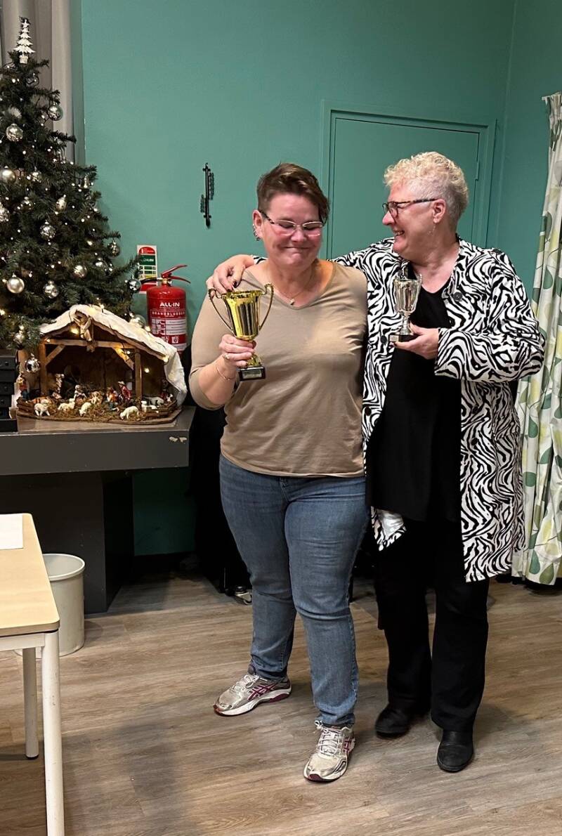 Jacqueline had minder te verliezen wat betreft de eindstand van 2024, maar dat maakte haar niet minder gemotiveerd. Ze ging volledig voor de toernooizege – en met succes! Met vier overwinningen in vier rondes en een indrukwekkend puntentotaal vierde ze een glorieuze overwinning. Op de foto zien we haar samen met de winnares van het jaarklassement.
