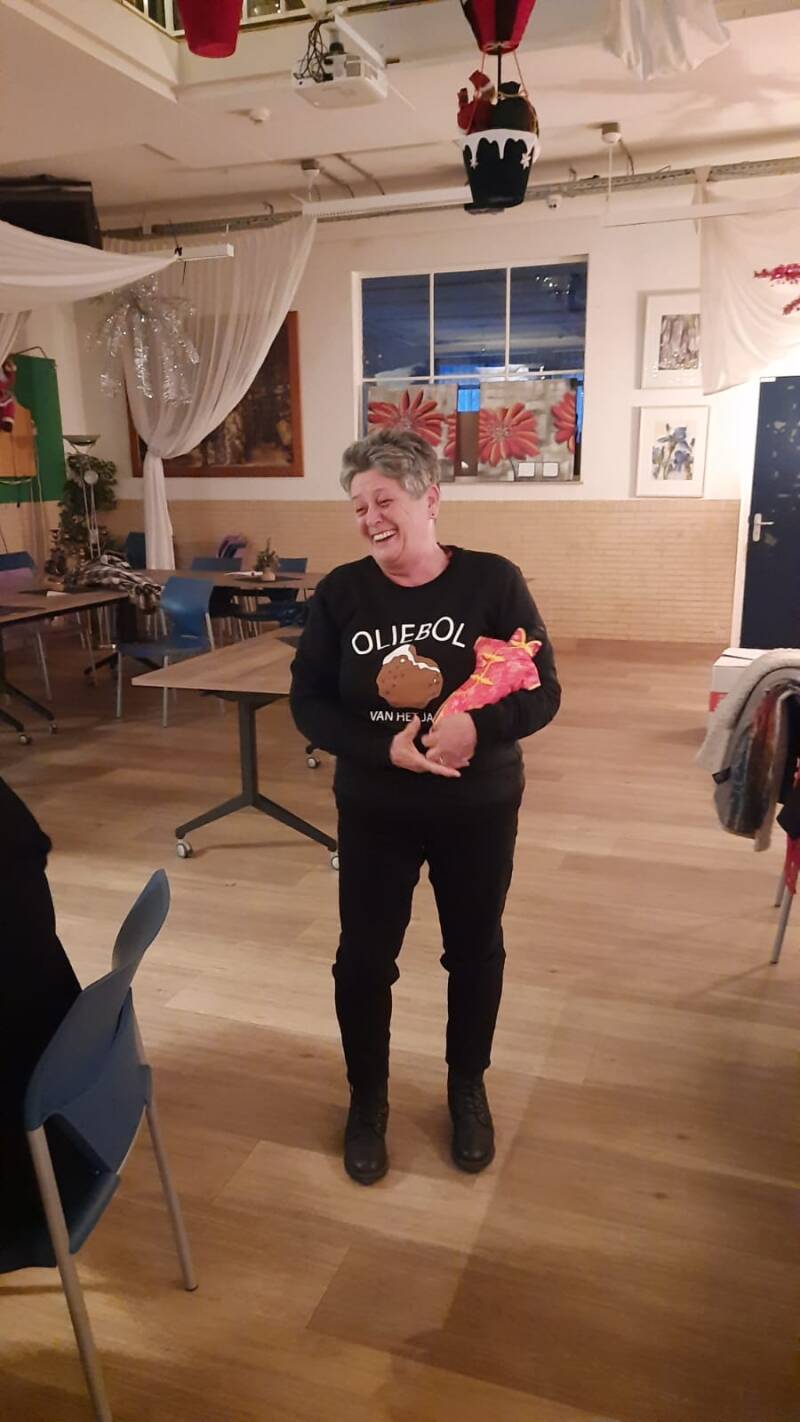 De hoogste trede was voor Trees Mooren. Bij verschillende toernooien rammelde ze al aan deur met hoge klasseringen maar nu was het dan ook echt raak. Met de volle mep van 12 tafelpunten hield ze drie spelers met 9 tafelpunten achter zich. (Dimphy 2e, Jacqueline 3e en Olav 4e). Tijdens de prijsuitreiking, waarbij de spreekstalmeester voor iedereen een vriendelijk woordje over had, werd ook de sweater uitgereikt aan Trees. Met de toepasselijke titel "Oliebol van het jaar" maakt Mooren een mooi begin met 2024 en volgt ze illustere namen op als Kees Borremans (2022), Diana van de Wetering (2019), Anja van Oorsouw (2018), Ada Swinkels (2017) en John Kuijpers (2016)